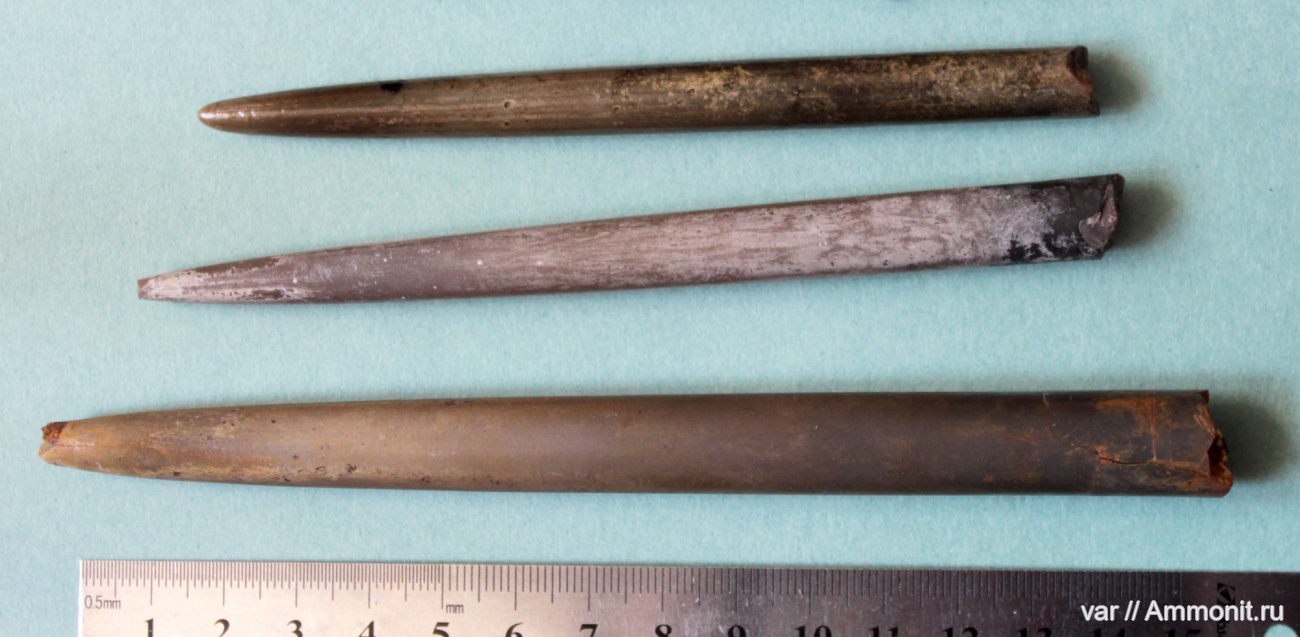 Три белемнита Cylindroteuthis (C.) obeliscoides (Pavlov, 1892). Вид со спинной стороны.