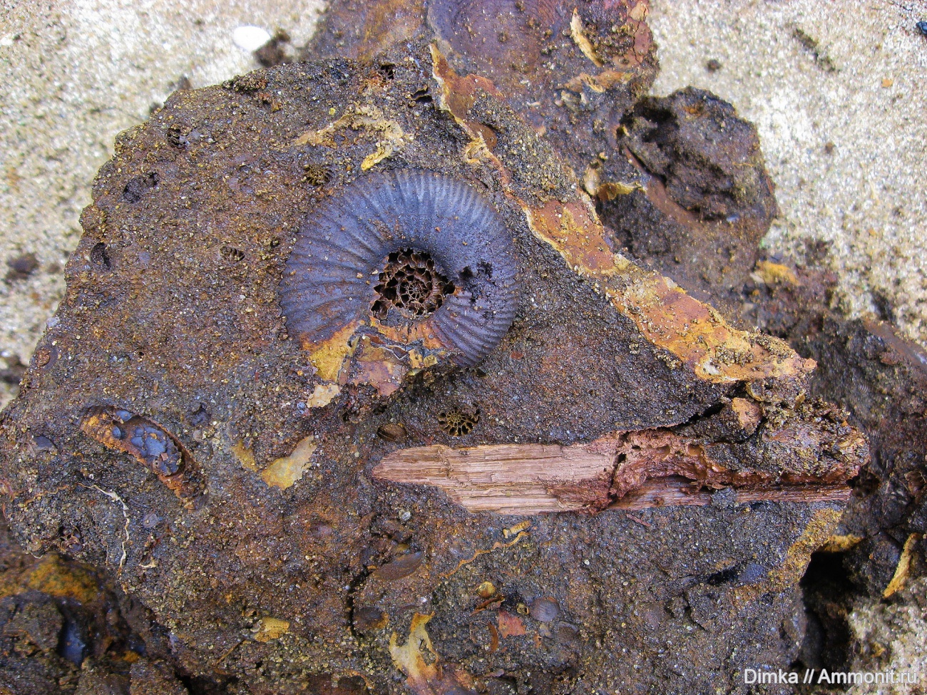 Небольшой аммонитик, диаметром около 4 см. в породе с другими окаменелостями. Это фото к обсуждению аммонита Laugeites stschurowskii , что в Глебово и Мостово только крупные встречаются.