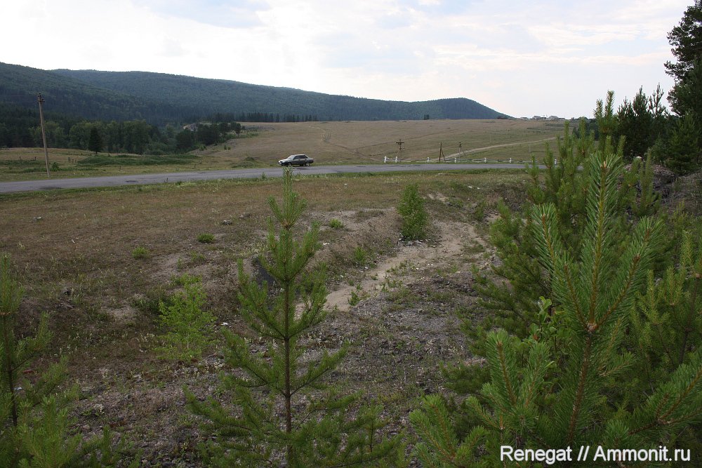 Точка с которой ведётся съёмка и есть место нахождения образцов (в основном брахиоподы и колонии кораллитов), на горизонте как ориентир деревня Серпиевка. С другой стороны дороги пересыхающий на лето ключ, там россыпи обломков кораллов, что либо целое найти очень трудно, но возможно.