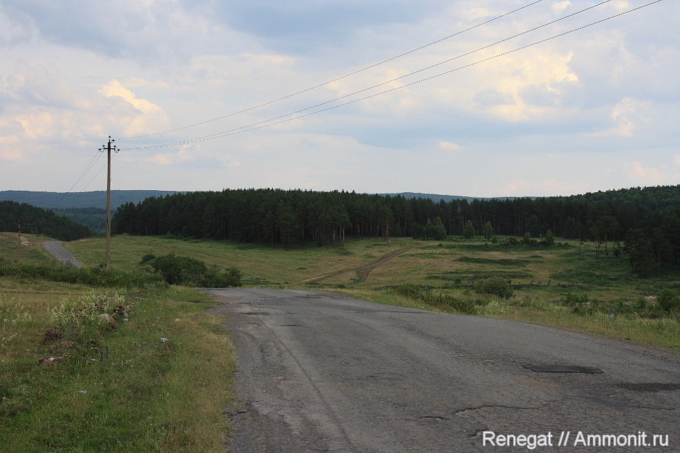 Эта дорога идёт от Серпиевки в Катав-Ивановск. Слева за кадром, срезанная горка на которую стоит обратить внимание. Молодая поросль ёлочек, через несколько лет всё может там засыпать хвоей. Справа от этого места за кадром склон с дороги в овраг, там россыпи обломков кораллитов. Просёлочная дорога, которая идёт в сосновый лес, приведёт как раз к комплексу пещер, на которые в основном и приезжают посмотреть любознательные люди со всей страны. Асфальт уходит за пригорок, там мост через реку Сим. По берегам можно найти образцы, большей частью обточенные рекой.