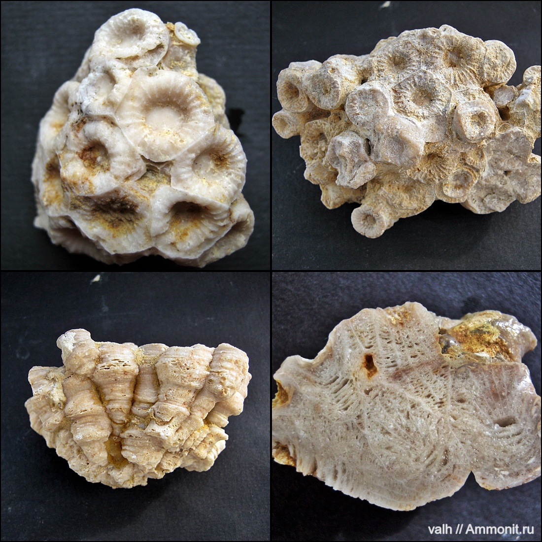 Колонии караваеобразной формы. Строение кораллитов осложнено многочисленными "остановками роста" и последующей регенерацией. Можно предположить что в морском бассейне происходили регулярные изменения параметров морской среды(каких, мы предполагать не можем),что вызывало замедление роста или полную остановку развития полипа и свёртывания его ткани до минимальных размеров.Предполагаю что полип мог "засыпать" на длительное время.При восстановлении благоприятных для развития параметров среды(к этим параметром я отношу и световой режим бассейна в частности)происходила регенерация из сохранившейся ткани нового полноценного полипа.Хорошо заметны места на кораллитах где полипы значительно увеличивались в размерах при благоприятных параметрах.