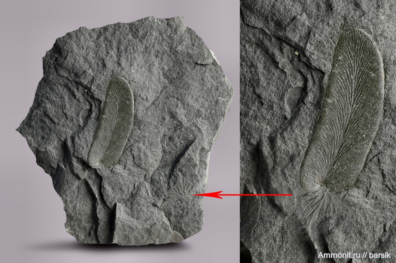 где одиночный лист Neuropteris наложился на что-то еще и получилась иллюзия проросшего листа с маленькими корешками. Помнил, что видел что-то похожее и среди своих образцов, и вот нашел этот камень.