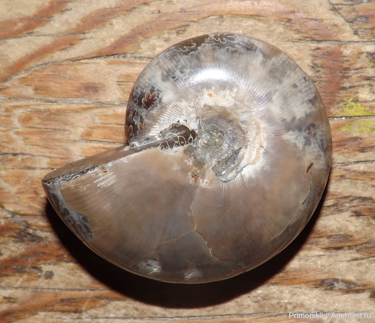 Euphylloceras sp. Приобретение прошлого года. Как всегда "замученный" мадагаскарскими умельцами. Интересен тем, что при жизни устье раковины было сколото по всему периметру, после чего моллюск успешно восстановил её. Видно, как на первых парах при восстановлении, линии нарастания раковины изгибались по излому, постепенно выравниваясь.