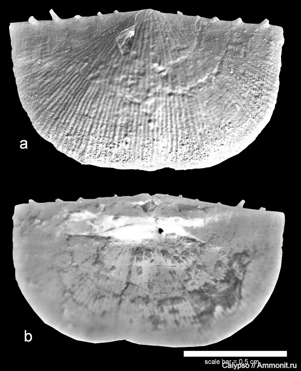 a - вид на брюшную створку - снято с напылением хлористым аммонием;