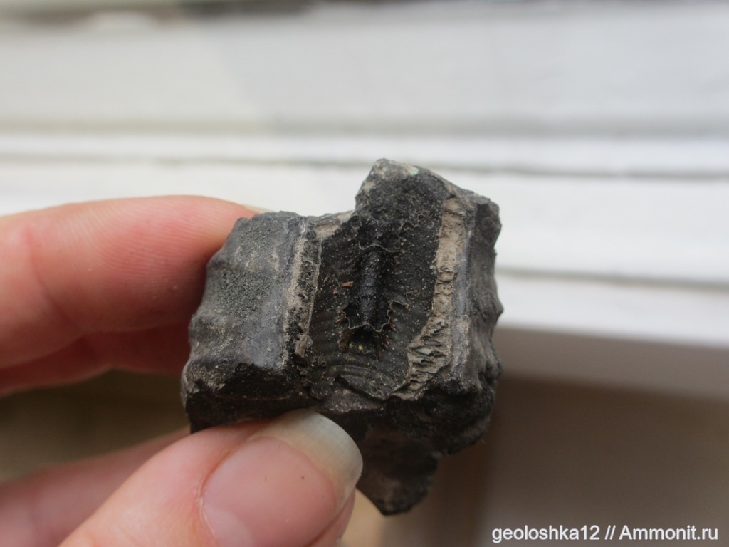 Эх, буровики раздавили. Размером был 8-10 см.В центрально части видны остатки перегородок камер и сифон.