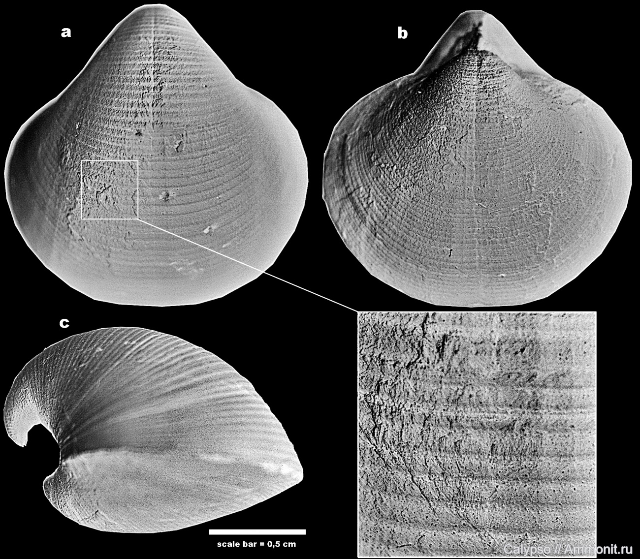 На врезке показан участок раковины со скульптурой в виде узких концентрических лент (на 5 mm в средней части раковины насчитывается, приблизительно, 15-20 таких лент).