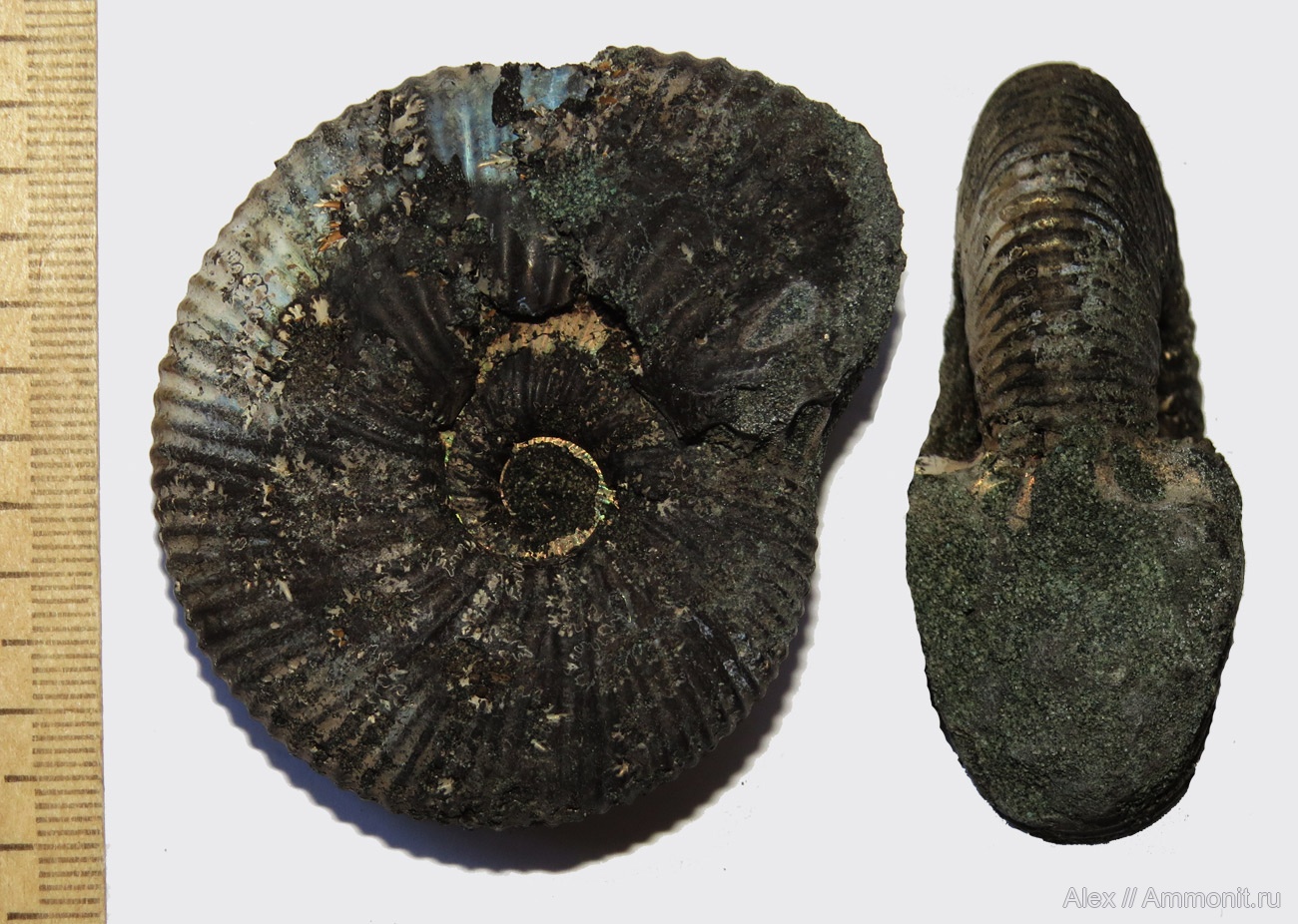 С границы virgatus-nikitini, собственно там много виргатитов-дорсопланитов лежит на поверхности слоя, то есть наполовину в красноватых глинах зоны virgatus, наполовину уже в зеленоватых песках зоны nikitini. | ||||||