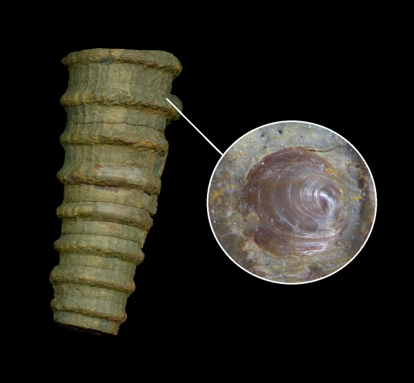 Cornuella ornata (Eichwald, 1840) с прикрепившейся ювенильной раковиной, предположительно, Orbiculoidea damanensis Sokolskaja, 1952