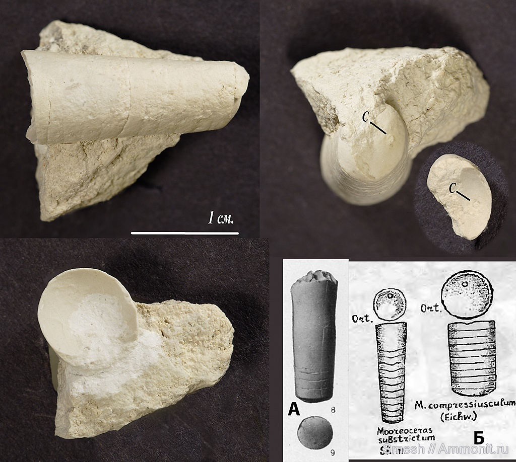 В [1] для Подмосковного бассейна приводится в том числе род Uralorthoceras Shimanskу, 1951 (врезка А на фото), которому наиболее близко соответствует наш образец. Другой доступный источник, [2], предлагает Mooreoceras compressiusculum (Eichw.), см. врезка Б на фото, правый образец. Причём Mooreoceras substrictum Shim. (слева на врезке Б) представляется гораздо менее вероятным, несмотря на помещение его в C2pd, т.к. его перегородочная линия образует отчётливую волну, тогда как у M. compressiusculum (формально C2mč) она прямая. По сведениям Alexq Морозов почерпнул данные для [2] из фундаментальных трудов ПИНА, так что ему можно верить. Посему остановимся на окончательном определении нашего псевдортоцераса как Mooreoceras compressiusculum Eichwald, 1840.
