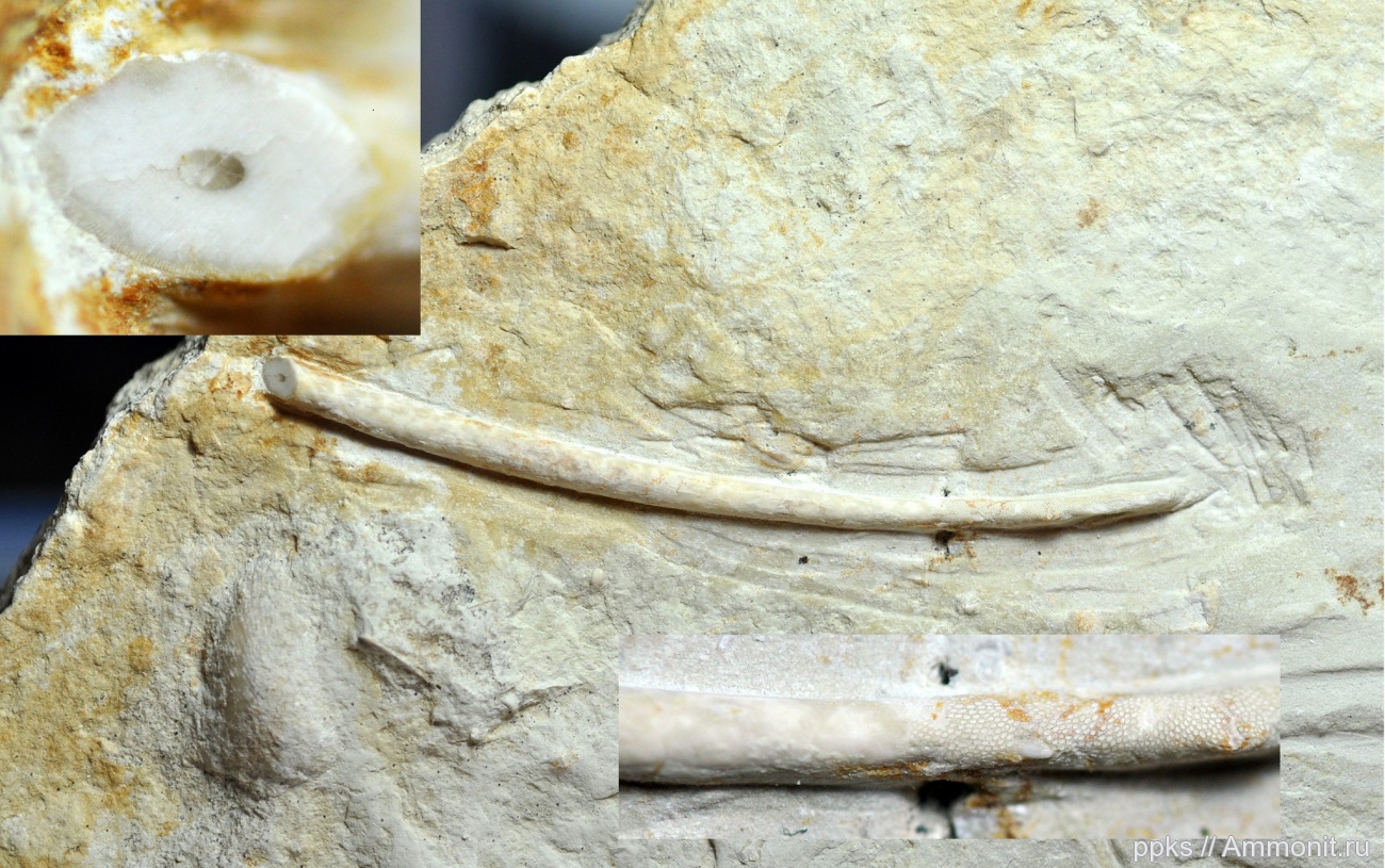 Игла морского ежа Archaeocidaris без проксимального конца. С дистальной стороны обросла мшанкой. | ||||||