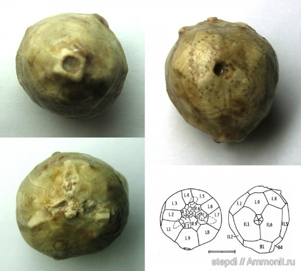 Тека цистоидеи Hemicosmites pyriformis с реки Волхов Ленинградской области. Отличается от других видов семейства Hemicosmitidae сильно редуцированными радиальными табличками и сильно развитыми фасетками рук, доходящими до латеральных табличек. Высота теки около 21,5 мм. Подскажите, пожалуйста, что за кружок на табличке L9 над перипроктом? И могут ли подобные образцы представлять собой монокристалл кальцита? (При сколе фрагмента образца скол произошел по трем плоскостям спайности, характерным для монокристалла кальцита)