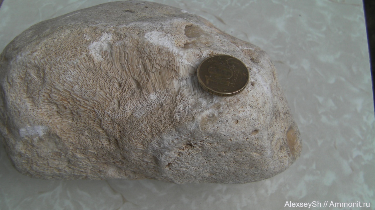 А это точно насчет минерального состава? По виду образец очень похож на обычный кальцитовый. Выглядит неплохо, даже несмотря на легкую окатанность. Вы по возможности уточните место находки и привяжите к классификаторам - губки, Московская область, предположительно карбон. | ||||||
