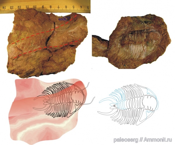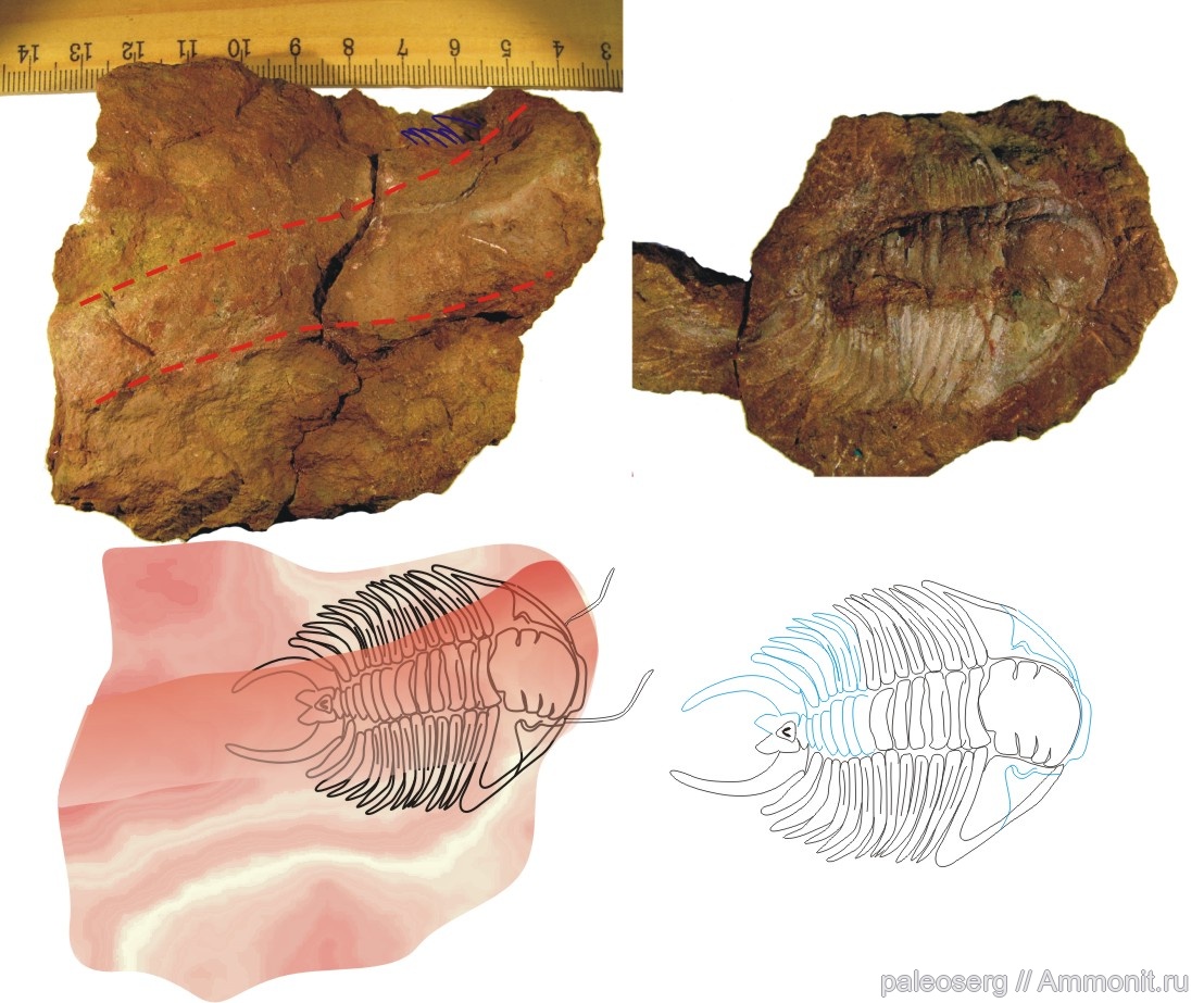 На верхнем левом фото – внешний вид плитки до препарации, пунктиром отмечено прохождение хода Thalassinoides, сверху справа выделены цветом – часть торчащего из него трилобита (правая щека и кончики первых плевр торакса). Сверху справа – вычищенный почти полный панцирь Acanthoparypha sp. Сохранность трилобита не слишком хорошая, так как панцирь был крайне тонкий (доли миллиметра) и лежал в уплотненной породе «хода». Часть пигидия вычистить не удалось. Ниже – прорисовка этого панциря, синим цветом указаны реконструированные умозрительно части. Снизу слева – реконструкция трилобита внутри его хода, который он проделывает в осадке на дне ордовикского моря.