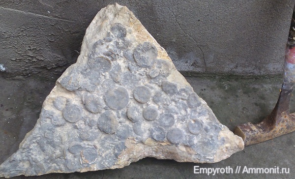 Плотные карбонатные песчаники с обильными одиночными кораллами М. intumescens "второго циклолитового уровня"(нижний готерив, зона Lyticoceras nodosoplicatum).