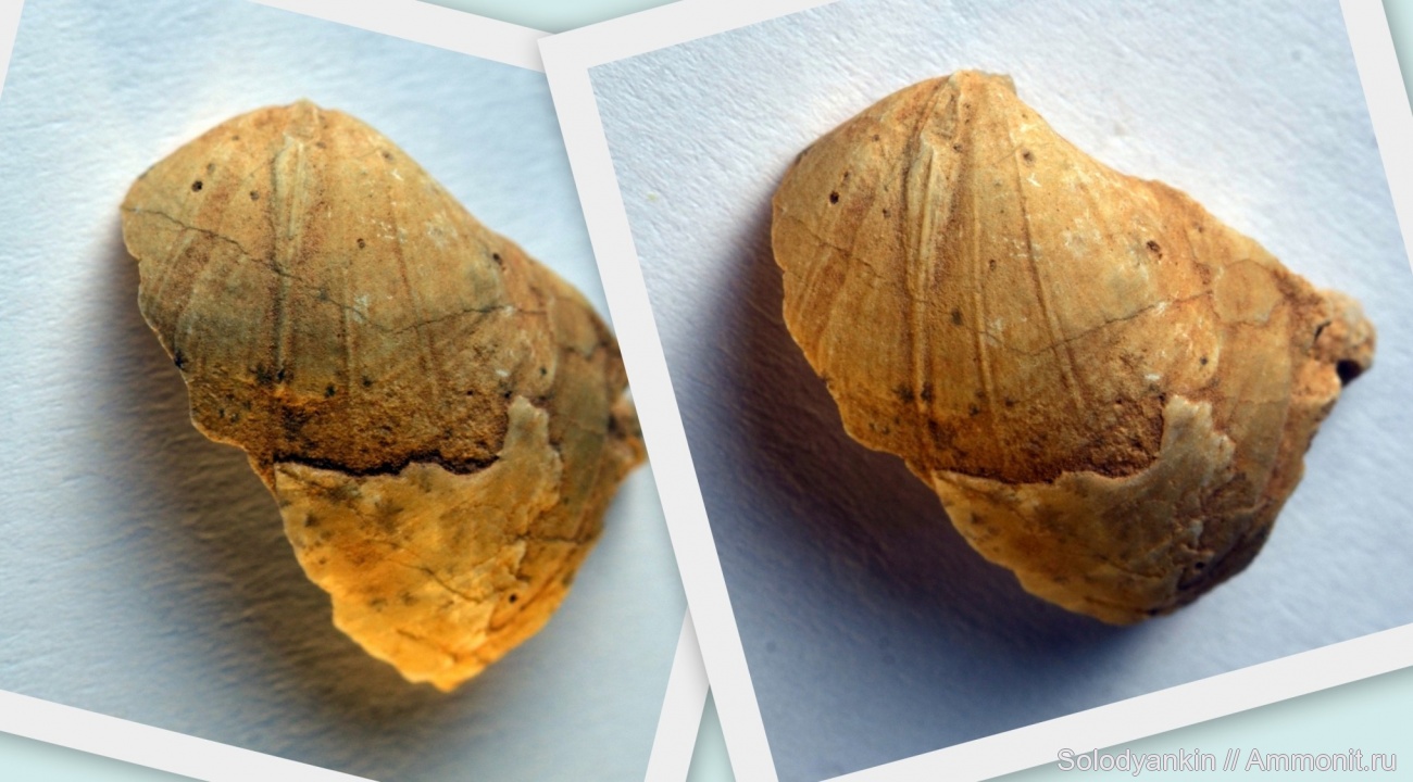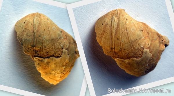 Радиально расходящиеся от макушки валики это они и есть, и это не скульптура раковины, поскольку фрагмент гладкой створки сохранился в виде небольшого кусочка внизу. | ||||||