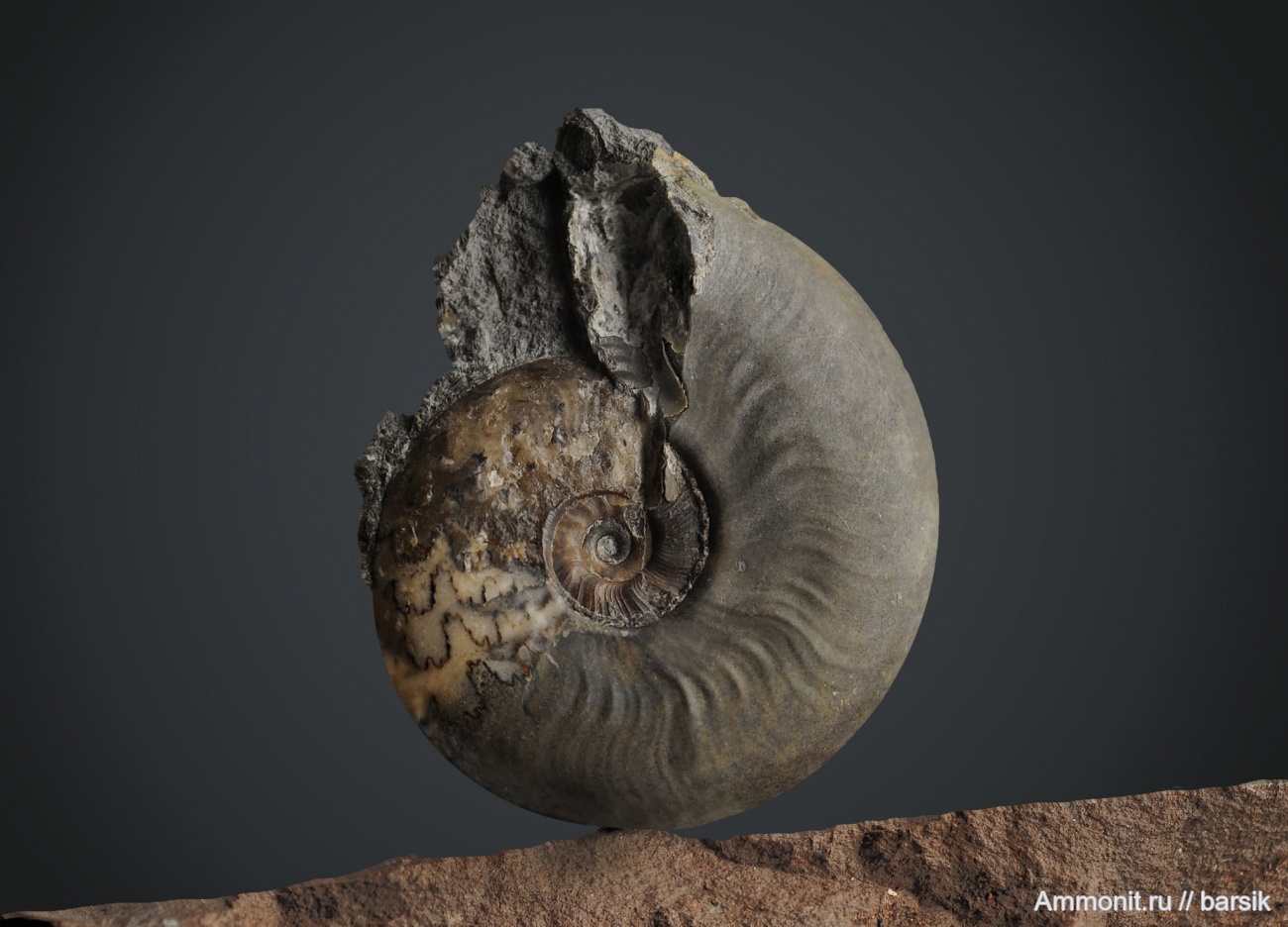 Даже в одном камне и буквально на расстоянии в несколько сантиметров ближе к поверхности конкреции порода меняет цвет на охристый и уже значительно мягче, сами аммониты здесь имеют ярко-желтую окраску. Фрагмокон и жилая камера у этого типа сохранения обычно замещены одной и той же породой.