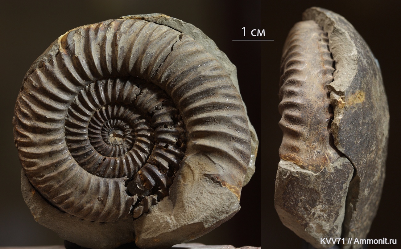 Parkinsonia из Карачаево-Черкесии - подарок Михаила (barsika). Наибольший диаметр 6 см, наибольшая толщина 1,5 см. Аммонит, кроме отличной сохранности, примечателен почти полностью сохранившимся устьем.