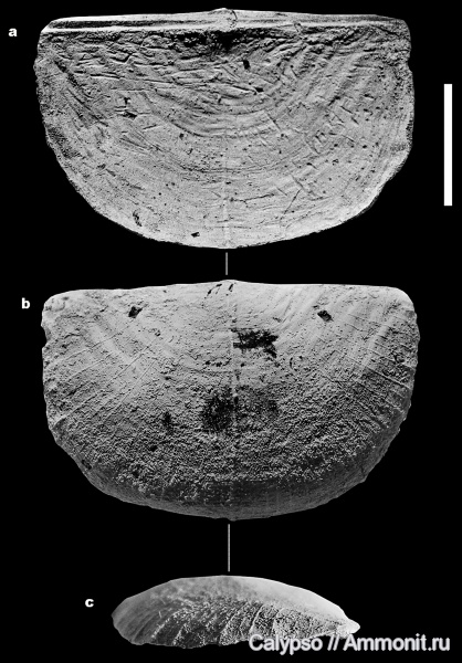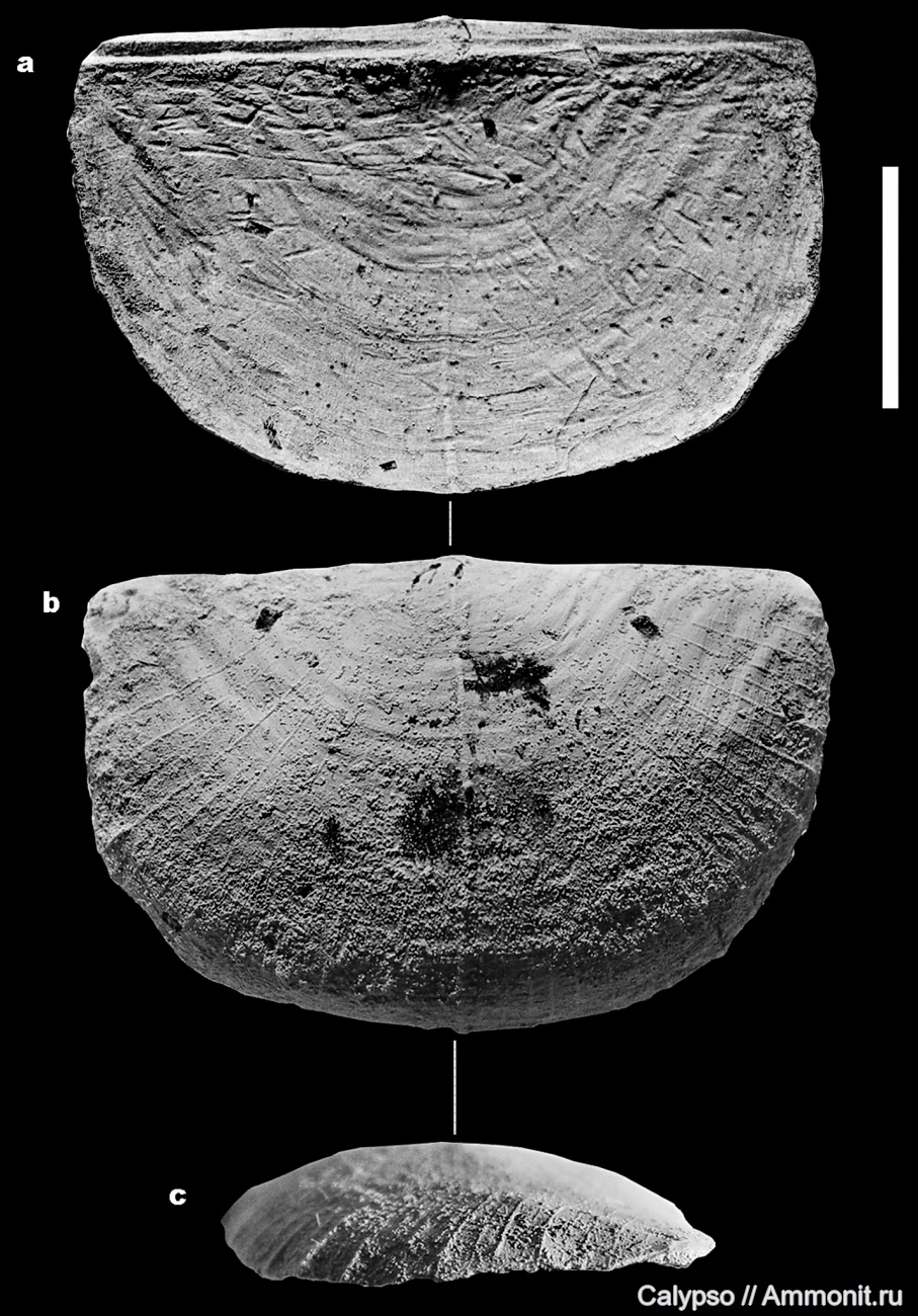 Очень интересная скульптура - помимо чётких радиальных струек, имеется одно ярко выраженное, в виде шва, разделяющего раковину точно по осевой симметрии. Этот шов отображается также и на спинной створке [a]. Кроме того, на брюшной и спинной створках имеются слабые концентрические морщины. Микроскульптура брюшной створки представлена тонкими концентрическими струйками, которые пересекаясь с радиальными, образуют сетчатый орнамент.