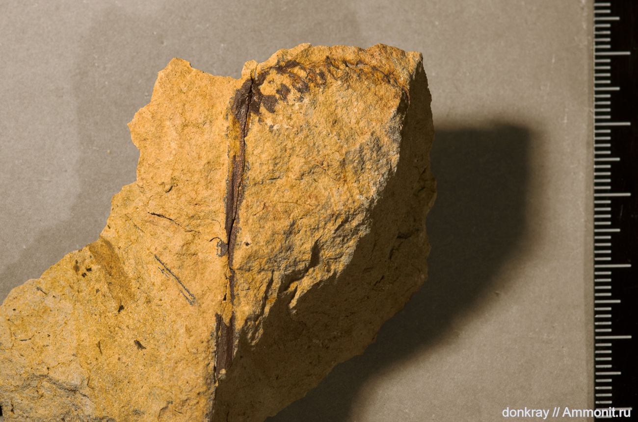 Риниофиты - первые наиболее примитивные высшие растения вышедшие на сушу Земли. Произошло это в силуре - девоне. В ископаемом состоянии обычно сохраняются только отпечатки осей и очень редко отпечатки спорангием. В моем случае, сохранился отпечаток оси и спорангии.