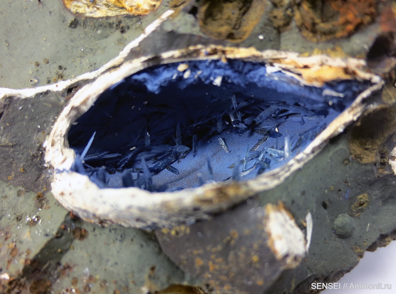 Внутренняя поверхность раковины двустворки покрыта "аморфным" вивианитом,и тут же выросли кристаллы этого минерала,необычного ярко-синего цвета.