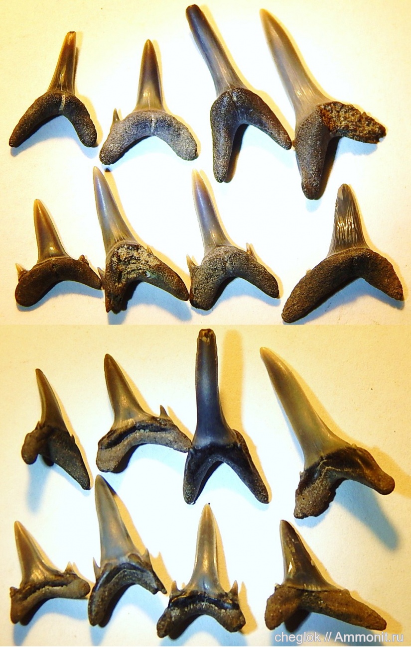 Carcharias hopei - невалидный синоним Hypotodus verticalis, а из этих зубов гипотодусами могут являться, скорее всего, лишь образцы 1 и 2 справа в верхнем ряду, и 1 и 3 нижнем (характерный наплыв эмали на лабиальной стороне, ширина коронки (среди зубов Hypotodus зубы того же положения в челюсти что и остальные образцы коронки были бы намного шире) и размеры боковых зубцов). | ||||||