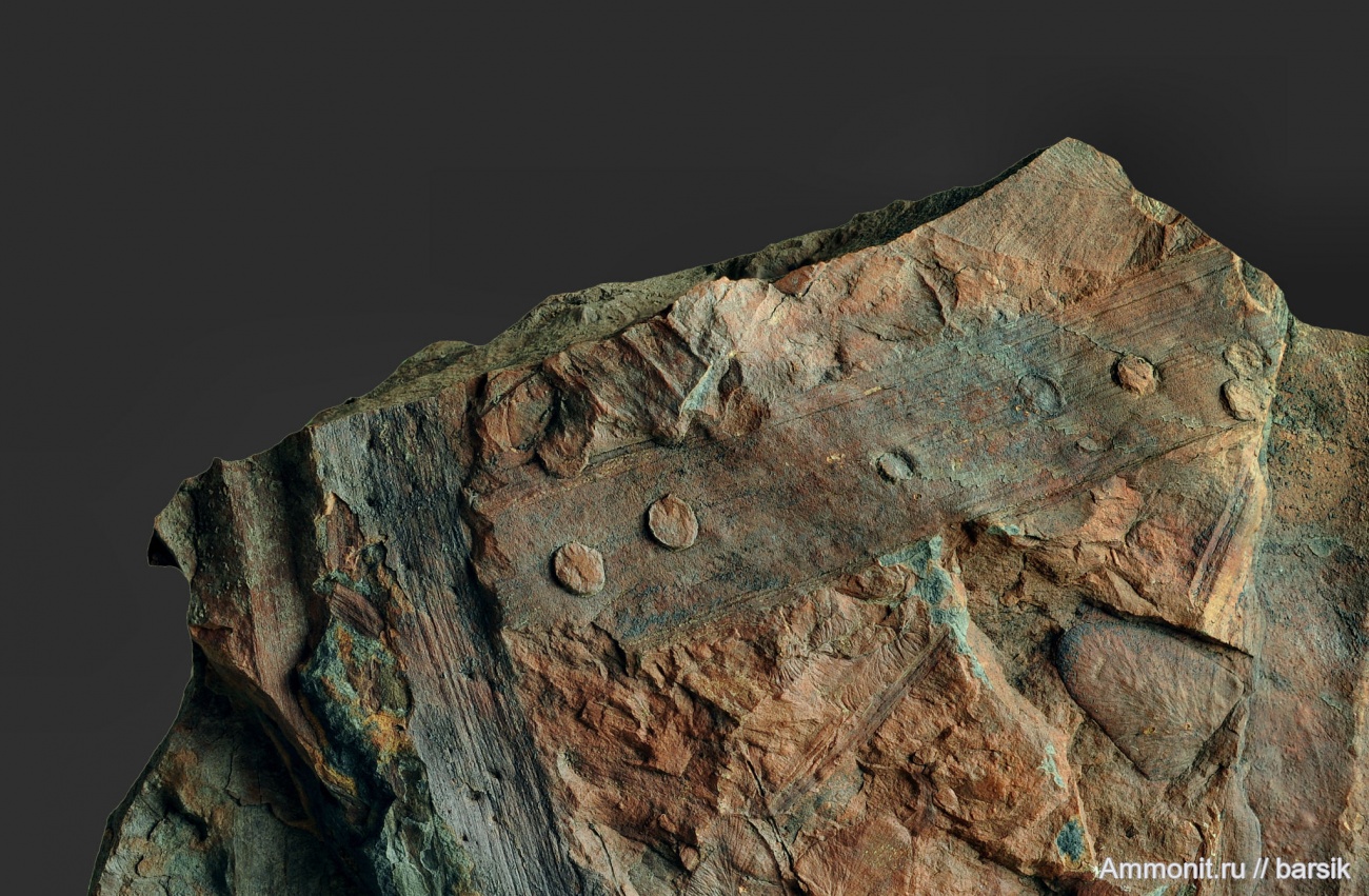 Еще один образец следов жизнедеятельности ископаемых насекомых на стебле папоротника. Интересно, что по правилам Международного кодекса зоологической номенклатуры, ископаемые биоповреждения описываются как ихинороды и ихиновиды.