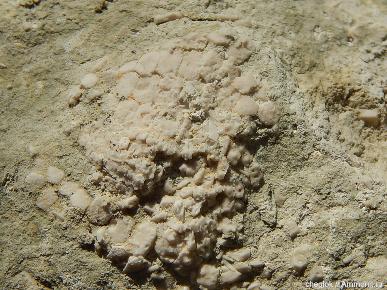 в крайний раз в Цемгиганте я нашёл на глыбе белого известняка с зеленоватым глинистым слоем на поверхности (верный признак обилия фауны) вот такой объект. Как поведал Руслан, сие есть бренные останки морского ежа. Размер около 4 см.
