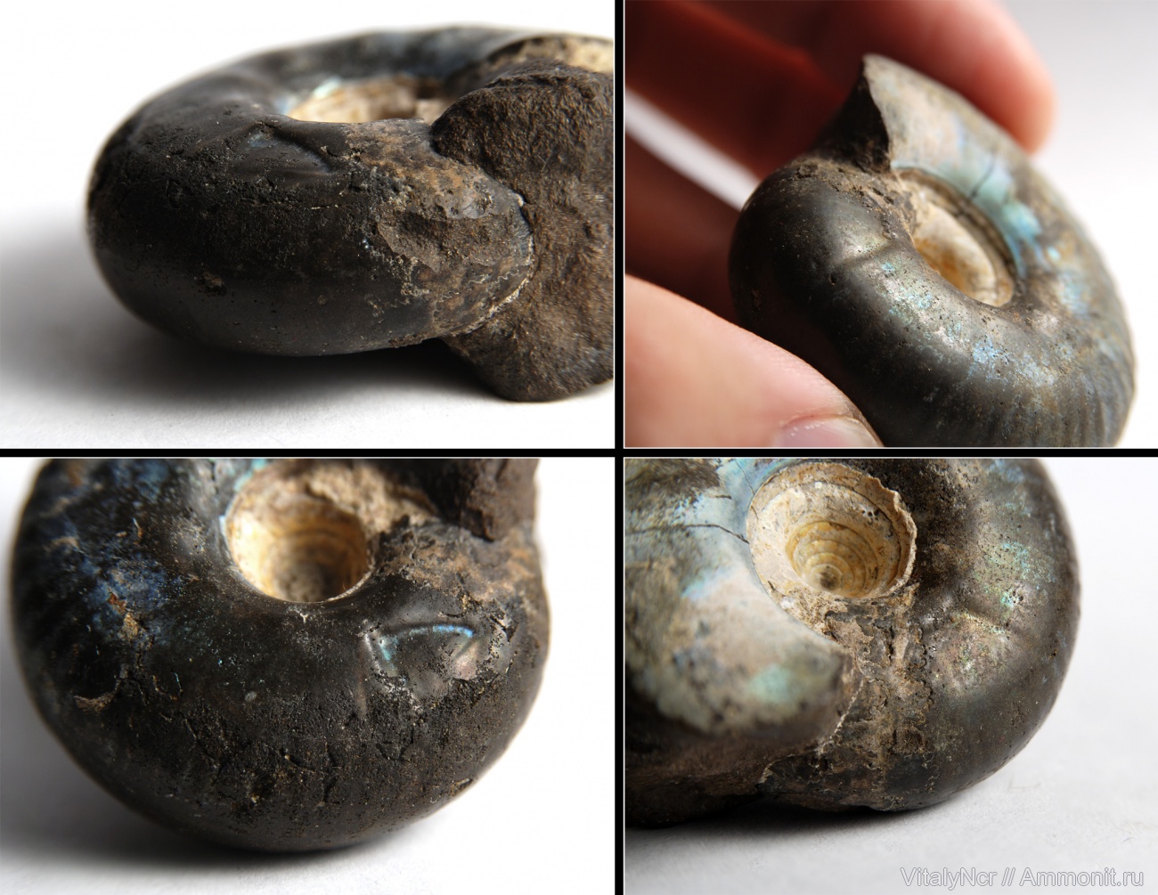 По-моему, там остатки перламутра видны в этих ямках (по крайней мере на левых фото - синенький цвет по краям). Выходит, что это отпечаток самой раковины, просто в этих местах были какие-то аномалии. Скорее всего это следы от заживленного укуса (а боковые укусы часто бывают на обеих сторонах как например тут), просто мантия не пострадала, поэтому и шрама дальше нет. Чаще конечно при восстановлении выломанной части раковины возникает выпуклость (отражающаяся на ядре), но иногда бывает и вогнутость. | ||||||