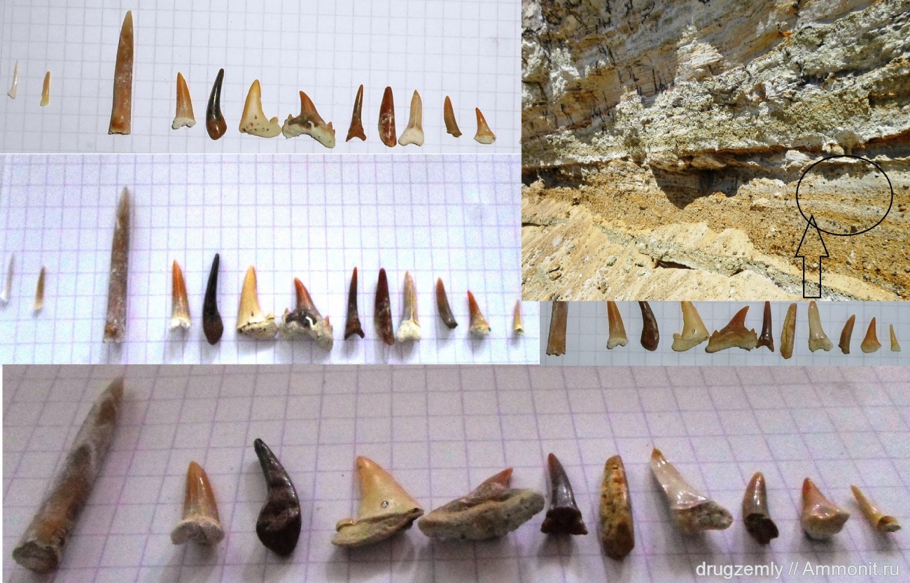Можно точно определить лишь 2 зуба - 3 (если считать от белемнита) - Striatolamia cf.macrota и 4 - Jaekelotodus cf. trigonalis. Возраст этих зубов - палеоген, эоценовая эпоха, белемнит переотложен из мела. | ||||||