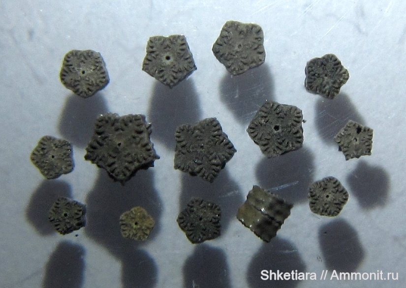 Больше всего подходит Pentacrinus cingulatus. Однозначно утверждать трудно, учитывая кучу схожих видов и крохотные размеры моих находок. В книге больше помогли даже не таблицы, а описание P. cingulatus, а на моем снимке помогло то, что один из образцов снят сбоку. | ||||||