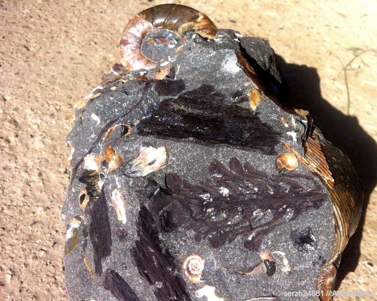 интересный образец флора и фауна всё перемешалось , а справа вроде кусок жилой камере аммонита Euphylloceras | ||||||