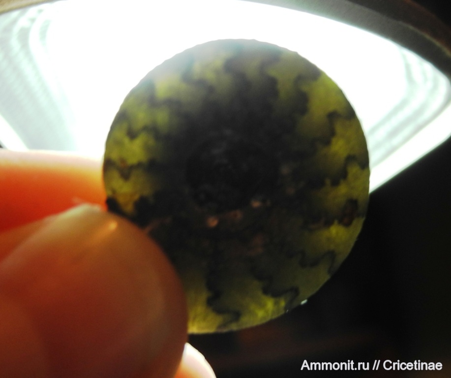 Аммонит Craspedites, замещённый зеленоватым кальцитом. Размер 3 см. Аммонит приобретён у Дмитрия (Dimka).