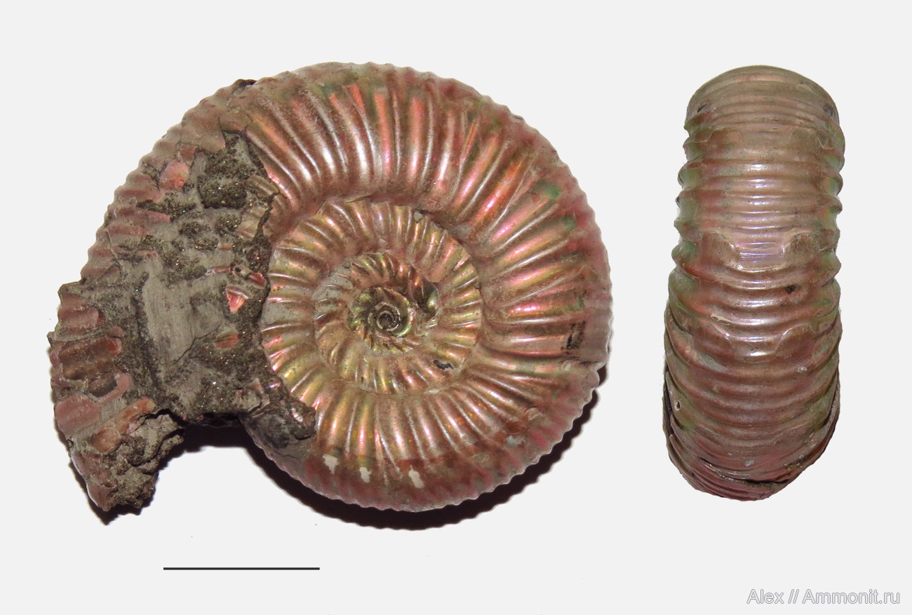 Небольшой аммонит Properisphinctes sp. Вероятно микроконх, сохрнилось частичнго сплющенное основание жилой камеры. На вентре видны параболы - следы временных устьев. Длина масштабного отрезка 1 см.