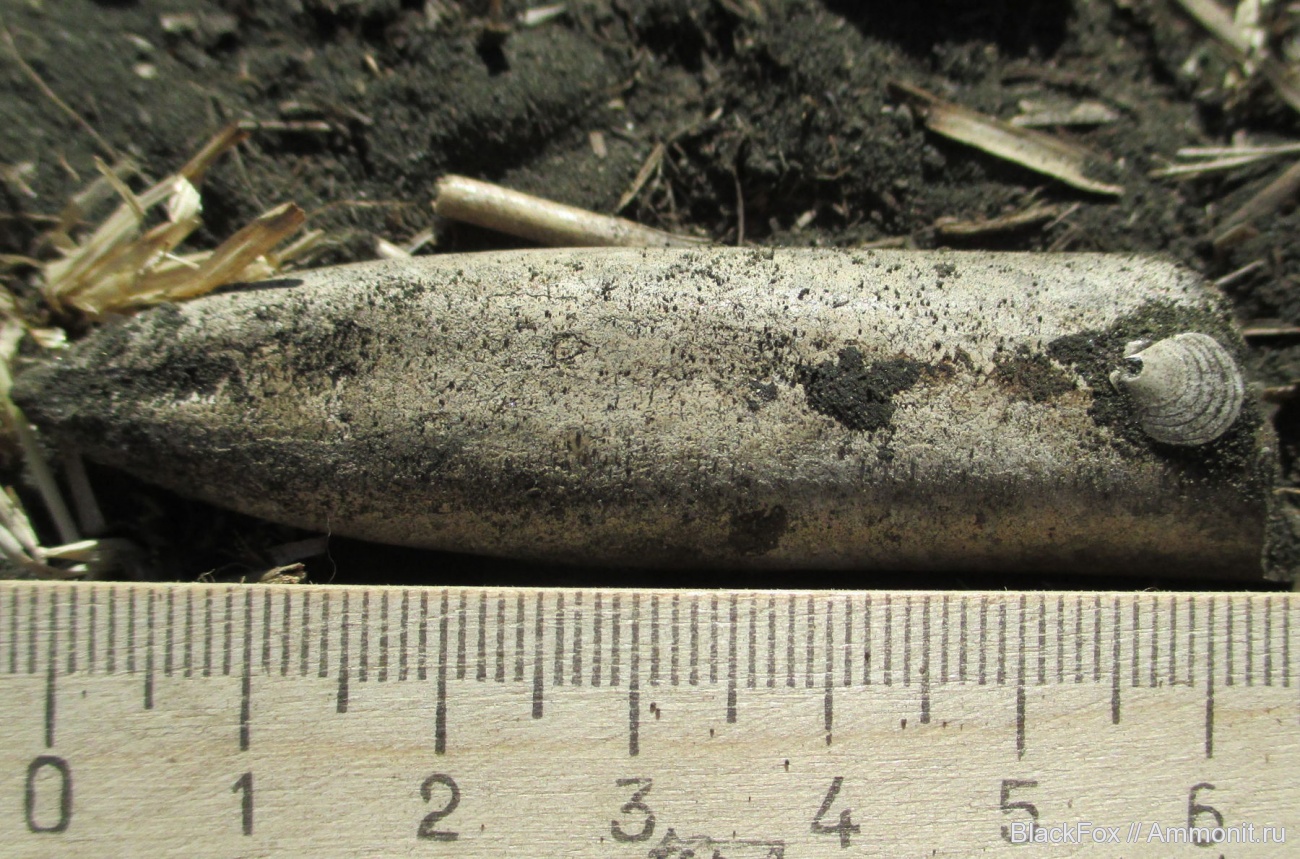Створка моллюска Entolium numulare на ростре белемнита, посмертное положение.