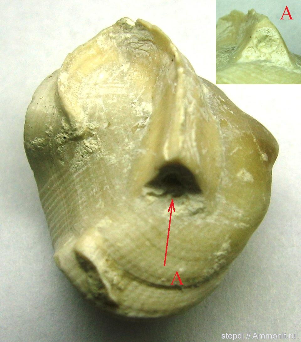 Трубка серпулиды, прикрепленная к раковине верхнемеловой брахиоподы Cretirhynchia sp. Интересен тот факт, что сопряжение трубки с поверхностью раковины совершенно гладкое со всех сторон (см. дополнительные виды), а сама трубка имеет близкое к треугольному поперечное сечение (вид А). При этом в сечении виден круговой внутренний канал. Место находки: урочище "Меловые горы", г. Гродно, Беларусь. Возраст: верхний мел. Максимальный размер раковины около 25 мм.