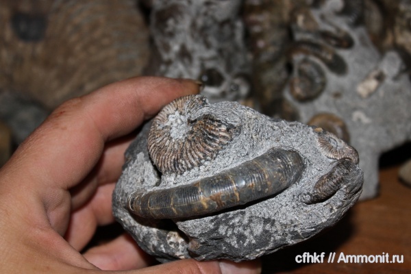 недавно в русле пересохшей реки нашла не большую конкрецию,на вид совсем не перспективную,и просто из любопытства бахнула ее молотком,а внутри оказался симпатичный гетероморф,и я как кинулась его расчищать)))