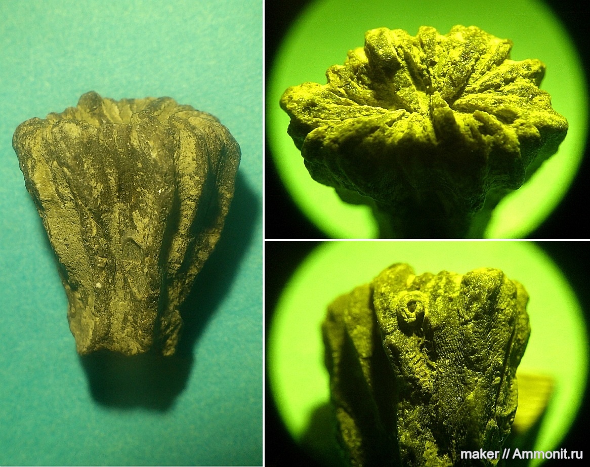 Коралл в самом деле странный. 2.5 см. Из верхней юры Нового Света. По началу я думал, что это растворёнка, но потом рассмотрел у него микроскульптуру на макрорёбрах. Последние похоже и составляют коралл. В общем первый раз такой вижу...