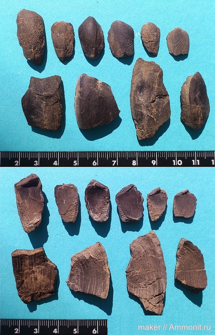 Существует некоторая особенность геометрии аптих Laevaptychus (в миру точечники) с осыпей Ласпи. Иногда я даже сомневаюсь, они ли это. Поэтому, пересмотрев ранее найденные аптихи и поискав новые, решил опубликовать сводное фото. Верхние ряды - целые аптихи; нижние - фрагменты. Возможно кому нибудь это фото будет полезно))).