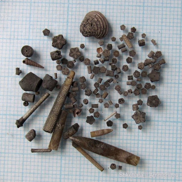 - членики морских лилий рода Pentacrinus (Isocrinus ?) диаметром примерно от 1 до 4 мм, изредка фрагменты по 2-4 соединенных членика;