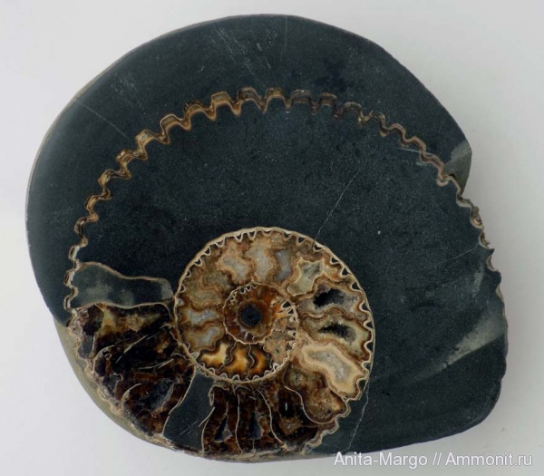 Снаружи был просто булыжник, неправильно-овальной формы, с одного края лишь немного просматривались очертания раковины. Сделав продольный срез можно только увидеть всю красоту образца. Диаметр 17 см.