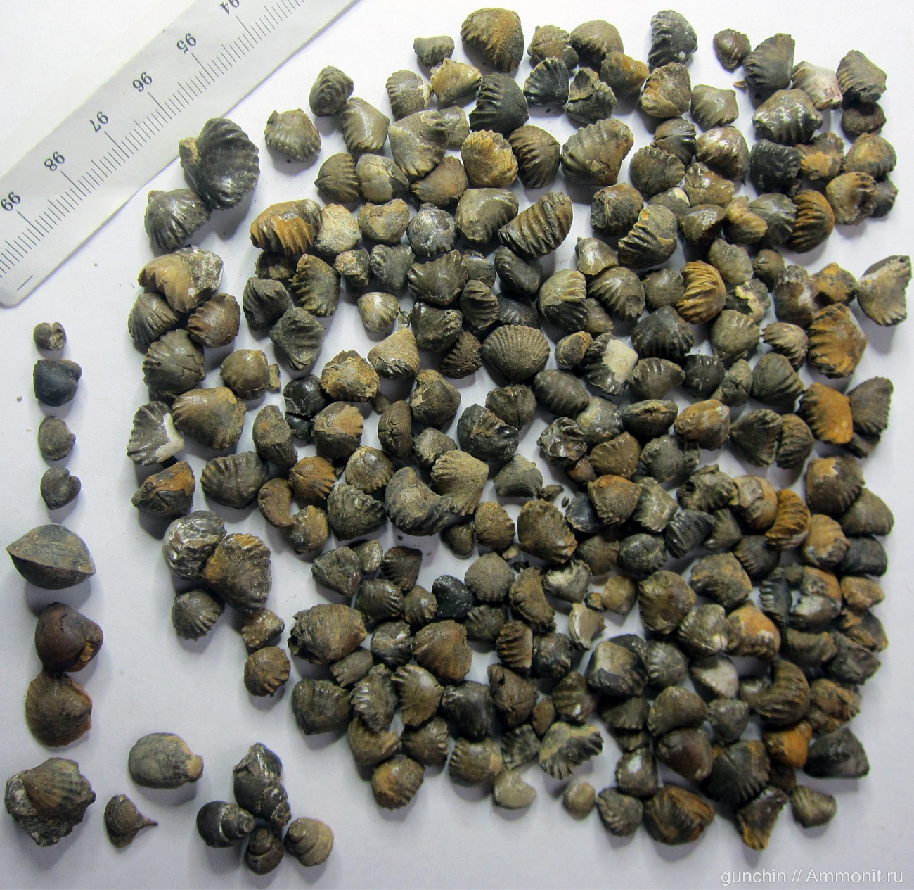 При извлечении аммонитов из конкреций можно собрать вот такую коллекцию. Порода просто набита брахиоподами. Реже встречаются двустворки и гастроподы.