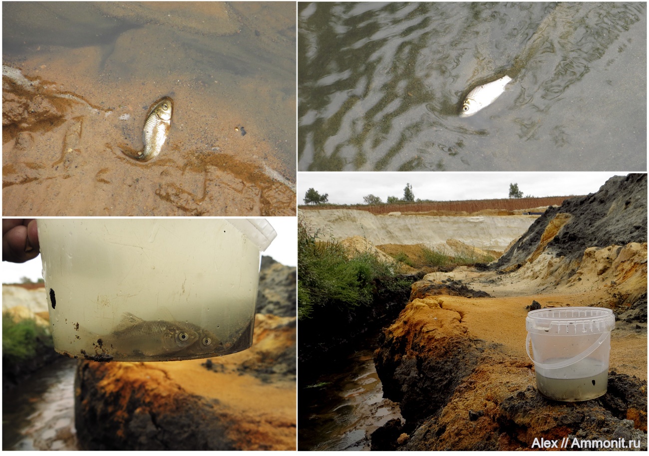 Во время недавней поездки в Еганово оказалось, что в дренажных канавах, прорытых в юрских слоях (из которых мы и добываем аммонитов), водится рыба. Причем рыба эта не просто спокойно плавает на глубоких участках, а пытается через отмели перебираться из одной канавы в другую, против течения. Мелкие участки рыбешки переползают на боку, иногда даже выбрасываются на мели, но потом снова сползают в воду. Я не знаю, что это за рыбки и чем вызвана их весьма рискованная миграция против течения, но выглядит это весьма необычно.