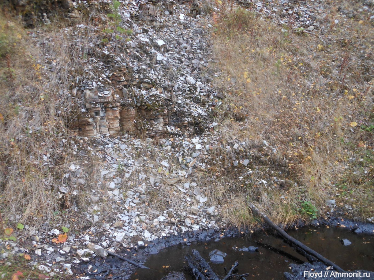 Видна слоистая структура известняка, в этих слоях и найдены мной различные аммоноидеи. Чуть ниже небольшое озерцо девонской нефти, которая выходит из пластов.