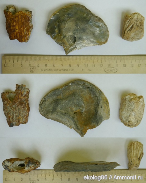 Образец в середине - это спинная створка юрского двустворчатого моллюска, что-то вроде Gryphaea. Углубление - это место прикрепления мускула-аддуктора - то есть там крепилась мышца, захлопывавшая створку. | ||||||