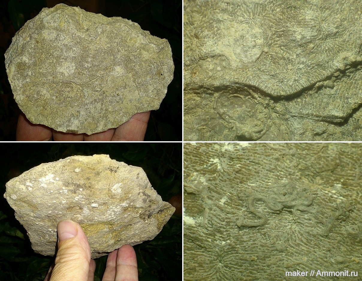В последнее время в урочище Менестер (Менистер) стали часто попадаться большие колонии плоских кораллов. Некоторые на вид погибшие ещё в берриасе в обрастателях и серпулах, некоторые - в прижизненном состоянии, но младенческом возрасте... Не видел я только кустистых кораллов. Вместо них одиночные с пережимами... Здаётся мне, что кораллы - монетки, блюдечки (на фото), и целые блюда (вот же придумал!) в большинстве своём суть колониальные кораллы на разных стадиях развития. Иногда плоский коралл не множится как коралл-цветочек, иногда начинает делиться (как на фото). Возможно это разные виды.