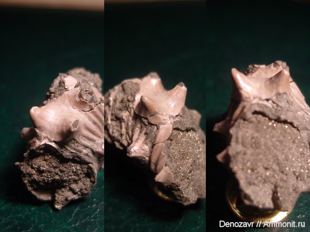 Эти шипы похожи на шипы аммонита с фото Kosmoceras gemmatum с сохранившимися шипами. Видимо, у молодых Kosmoceras gemmatum шипы были игольчатой формы, а чем старше они становились, тем больше шип напоминал по форме зуб или заостренный акулий плавник. | ||||||