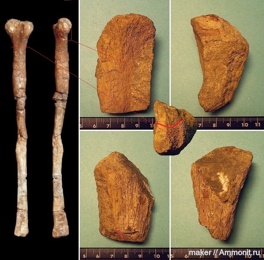 Фрагмент проксимального эпифиза малой берцовой кости задней конечности Менестерского зверя. Противоположный дистальному))). Нижняя часть осколка соответствует метафизу трубчатой кости. На первой зелёной врезке просматривается переход компактной костной ткани метафиза в губчатую эпифиза. Эпифиз сильно усечен в верхней части древней трещиной, заполненной позднее кальцитом (правая нижняя врезка). Участок эпифиза выше трещины утрачен. Нижний конец фрагмента имеет внешний слой из компактной костной ткани, внутренний - из губчатой . Его поперечное сечение согласуется с сечением метафизального участка малой берцовой кости Gideonmantellia amosanjuanae, используемого для сравнения (чёрная врезка). Выбор птицетазового динозавра для сравнения обусловлен анатомической схожестью строения задней конечности, но никак не размером. Вообще замечено, что фрагменты стопы Менестерского зверя ближе по строению к малым формам динозавров, но при этом размеры костей значительно их превосходят.