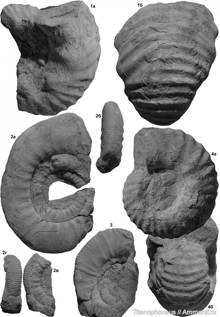 Фиг. 2 а-г. Okaites ex gr. rossicus (Siemiradzki). WN-139. Цудахар, сл. 16; средний келло-