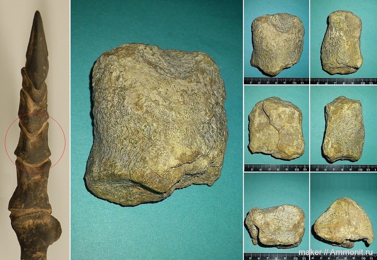 Пожалуй самый проблемный фрагмент скелета Менестерского зверя. Предположительно II фаланга IV пальца стопы. Сильные поверхностные разрушения дают основания предположить, что фрагмент был частично вскрыт потоком воды при формировании долины. Компактный поверхностный слой кости фрагментально растворен со стороны вскрытия до губчатого слоя (правая врезка, средний ряд, 1 фото). Второй тип повреждения - мелкое погрызение со стороны не подвергавшейся вскрытию потоком. Выявлено при препарировании (основное фото, правый и левый края образца). Предположительно работа мелких хищников, изменивших вид фаланги до неузнаваемости.