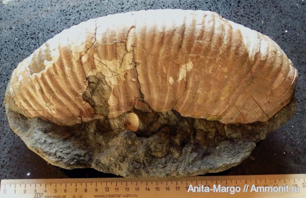 Пол часа раскрывали конкрецию, надеясь на крупную добычу. Но она смогла порадовать только обломком громадного аммонита. Какой тогда размер был у хозяина этого обломка?